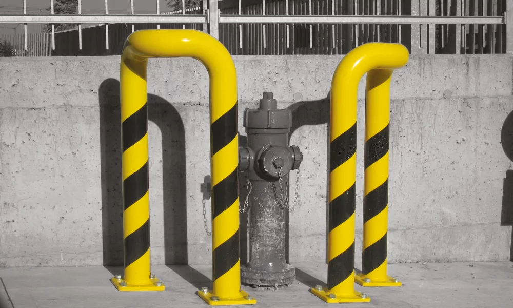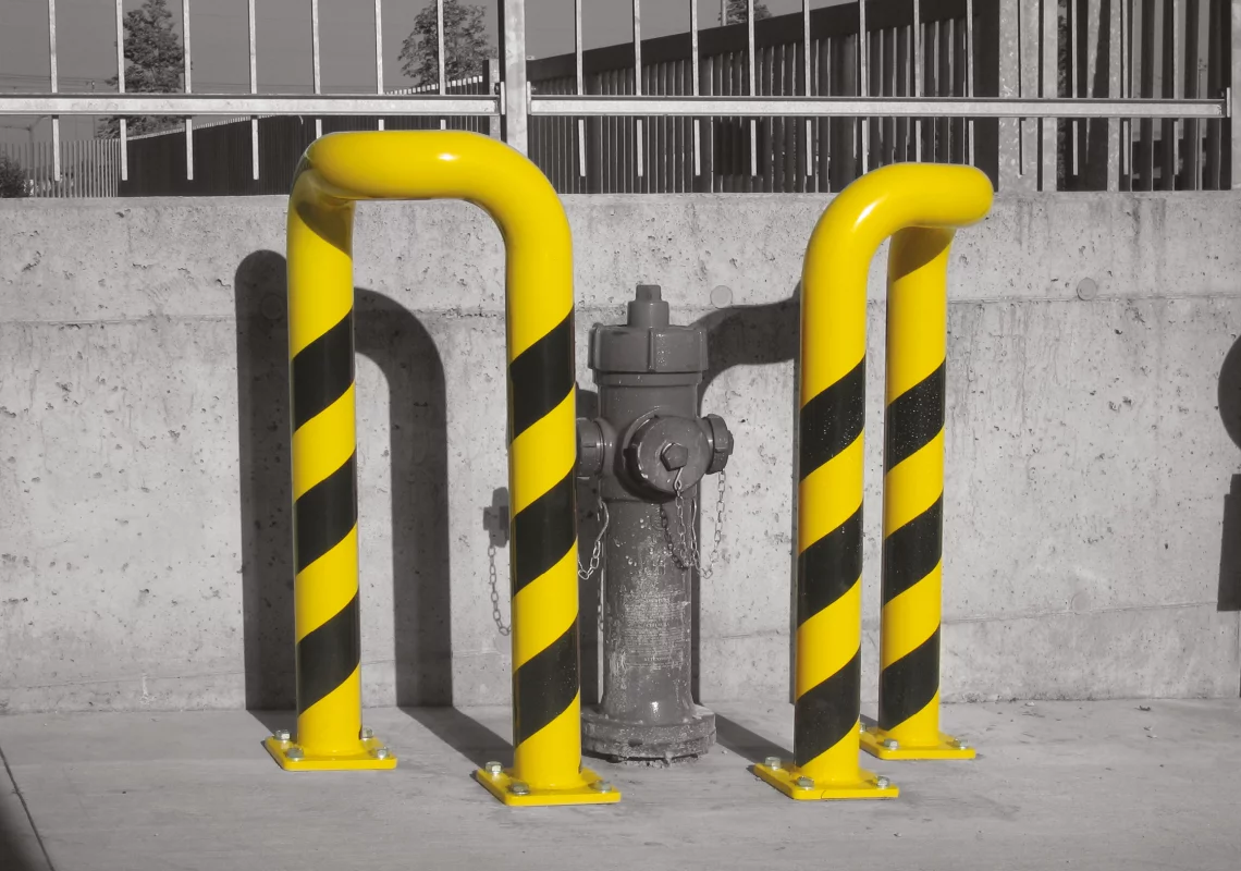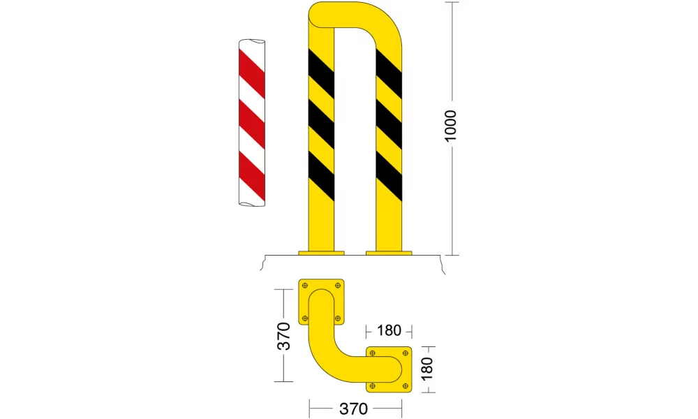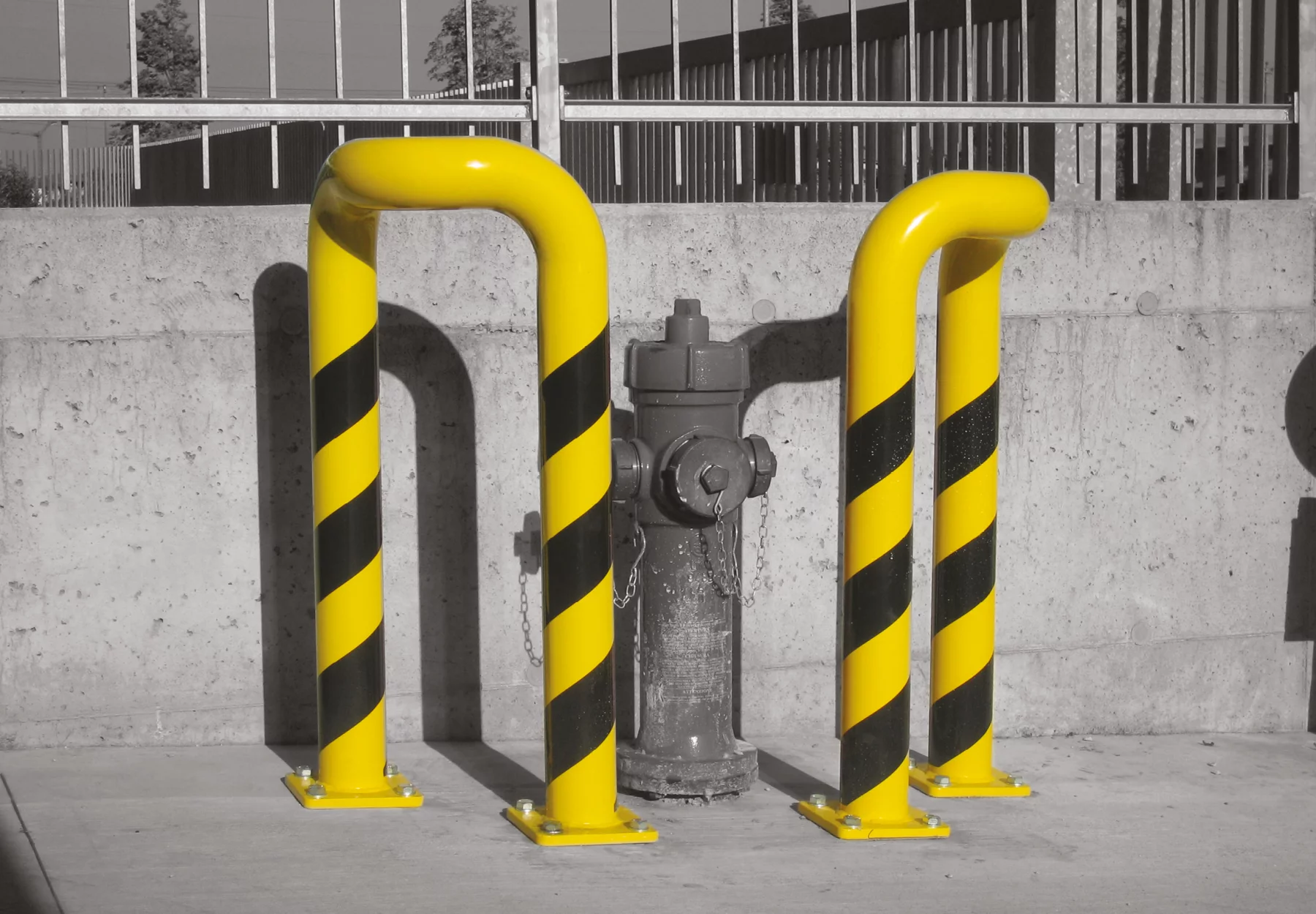 Made of steel of tubular shape Ø 102 mm with a running horizontal bar and two vertical posts with very thick square base plates. Protects systems, poles, corners, hydrants, gates.